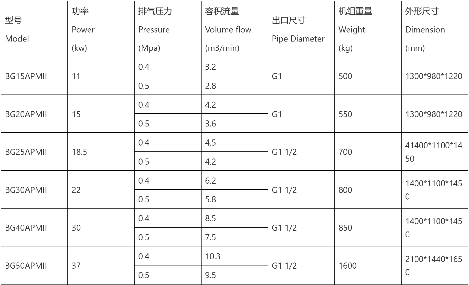 产品描述:经久耐用,技术成熟,产品稳定,超高性价比低压双级压缩永磁变频螺杆空压机技术参数/Technical parameter型号Model功率Power(kw)排气压力Pressure(Mpa)容积流量Volume flow(m3/min)出口尺寸Pipe Diameter机组重量Wei···